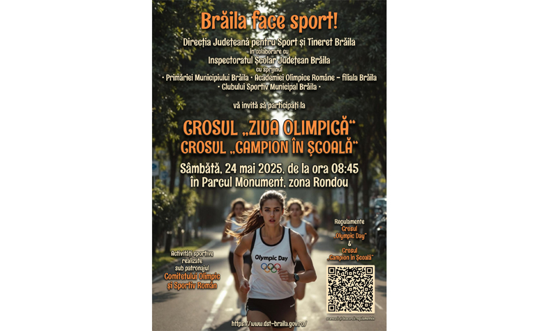 Organizatorii locali, Directia Judeteana pentru Sport si Tineret Braila (DJST), in parteneriat cu Inspectoratul Scolar Judetean Braila si Academia Olimpica Romana – filiala Braila, cu sprijinul Comitetului Olimpic si Sportiv Roman, al Primariei Municipiului Braila si al Clubului Sportiv Municipal Braila, vor pune la dispozitia participantilor tricouri inscriptionate, diplome si premii pentru cele doua evenimente care vor crea atmosfera unei zile dedicate sportului: Crosul "Campion in Scoala" si Crosul "Ziua Olimpica", se specifica in comunicatul emis de organizatori.