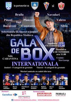 Sâmb?t?, 5 octombrie 2013, de la orele 17.30, ?i duminic?, 6 octombrie 2013, de la orele 11.00, Sala Carantina din Br?ila g?zduie?te “Gala Interna?ional? de Box”. Aceast? competi?ie este realizat? cu sprijinul Consiliului Jude?ean Br?ila, Clubului Sportiv Municipal Br?ila, Federa?iei Române de box ?i a Direc?iei de Sport ?i Tineret Br?ila.